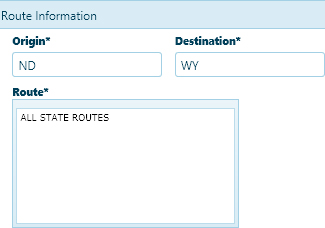 In the Route Information area, enter the Origin and Destination of your trip in the fields provided, then list highways and interstates on which you will be travelling in the Route box.