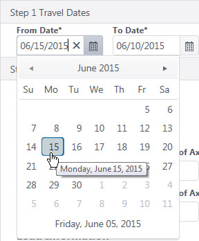 In the Travel Dates area, click the calendar icon to choose a From Date. The To Date will be calculated by the system.