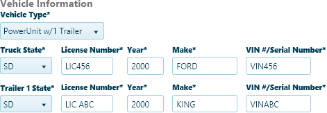 For both the Truck and Trailer, supply the License Number and the VIN then choose the state that issued the license.