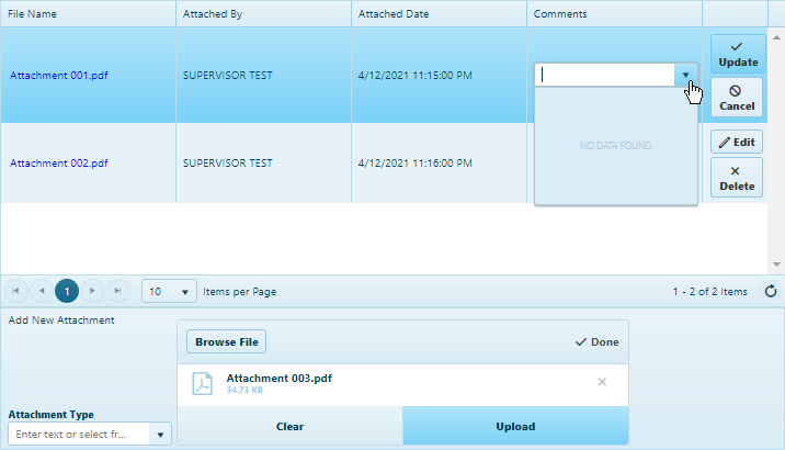 When the attached file appears in the table, click the Edit button to open the Comment options.