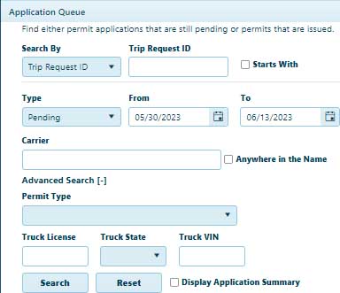 Open the My Queue page to search for existing applications or permits. You can also use the Route Check feature to analyze an active permit for new routing Restrictions.