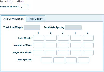 Enter Number of Axles then click the Axle Configuration button to provide complete axle information. On the Axle Configuration tab, enter the Axle Weight, Number of Tires, Single Tire Width, and Axle Spacing in the fields provided.