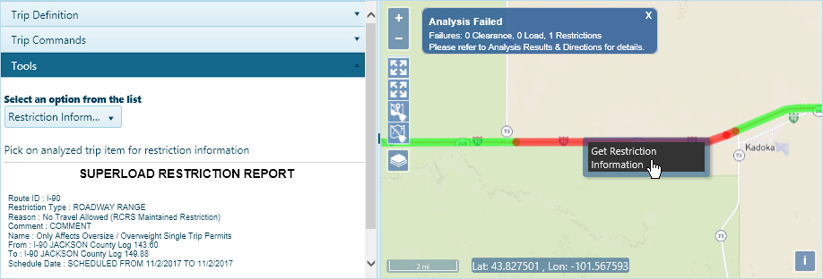 The cursor is now equipped to identify the restriction, so move it over the map and right-click on a red portion of the route then left-click the Get Restriction Information button.