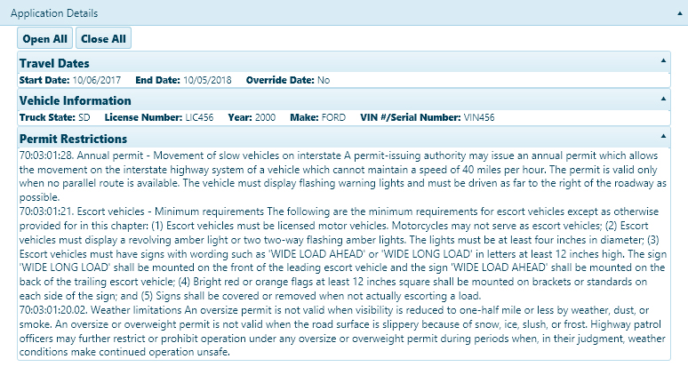 The Review page presents all of the application information collected in one place. Carrier, Vehicle, Axle, and Load information in addition to Travel Dates and Overall Dimensions come from the Application page.